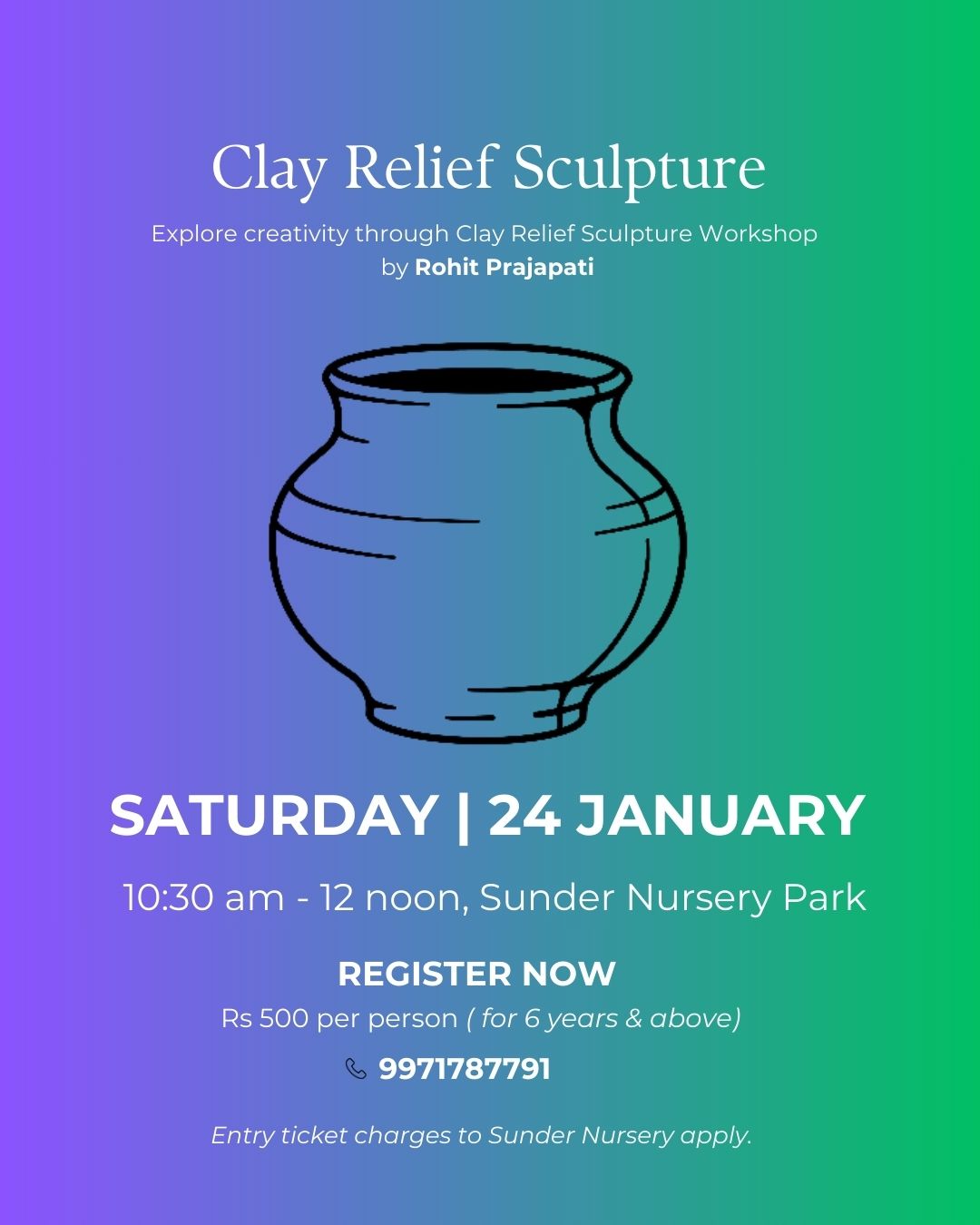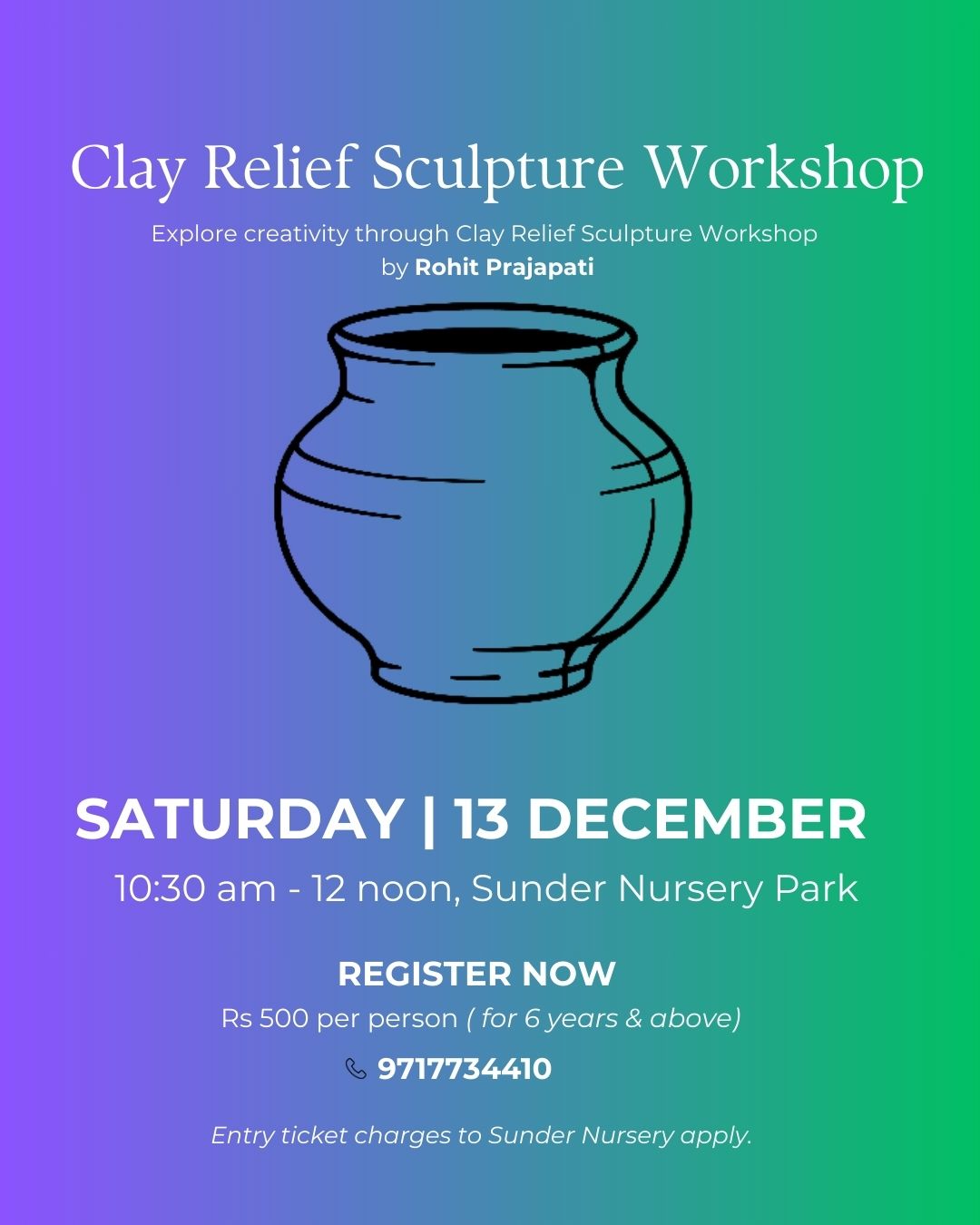This clay relief sculpture workshop, open to all ages, invites participants to explore the art of clay modeling in the tranquil, historic setting of Sunder Nursery, Nizamuddin, Delhi. Surrounded by nature, participants will learn to mold, sculpt, and shape clay into beautiful, three- dimensional reliefs inspired by nature, architecture, and personal expression. Designed to encourage creativity, mindfulness, and a connection to cultural heritage, the workshop offers guidance in crafting dynamic, layered clay artworks that are approachable for all skill levels. Key objectives include fostering artistic expression, introducing fundamental clay techniques like shaping and texturing, and using the inspiring ambiance of Sunder Nursery to create pieces reflecting India’s rich heritage.