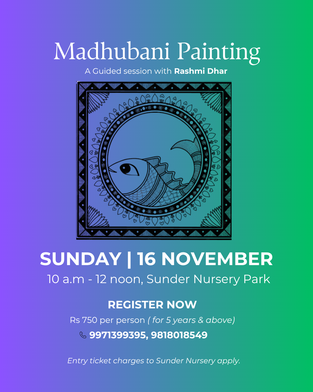 Dive into a Madhubani painting workshop for peace! 🎨 Release stress as you connect with nature's beauty and the vibrant ancient and traditional art form. This creative session is designed to help you find calmness, express yourself, and enjoy a fulfilling artistic journey.