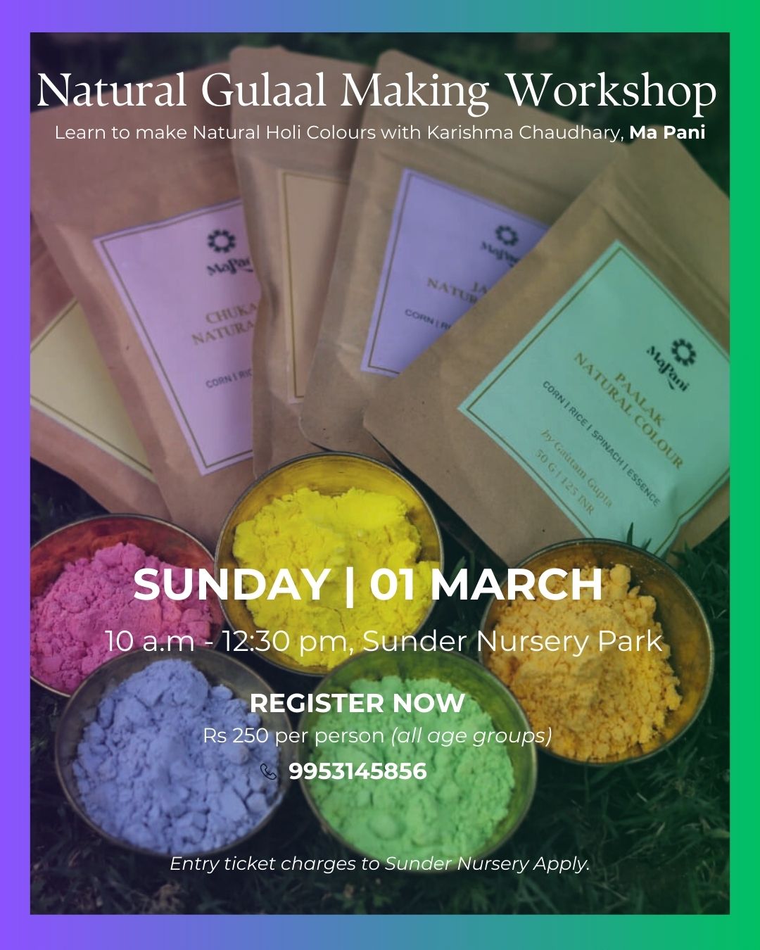 Join us for a hands-on Natural Gulaal Making Workshop and learn how to craft vibrant, skin-friendly colors using flowers, herbs, and kitchen ingredients. Celebrate traditions the eco-friendly way!