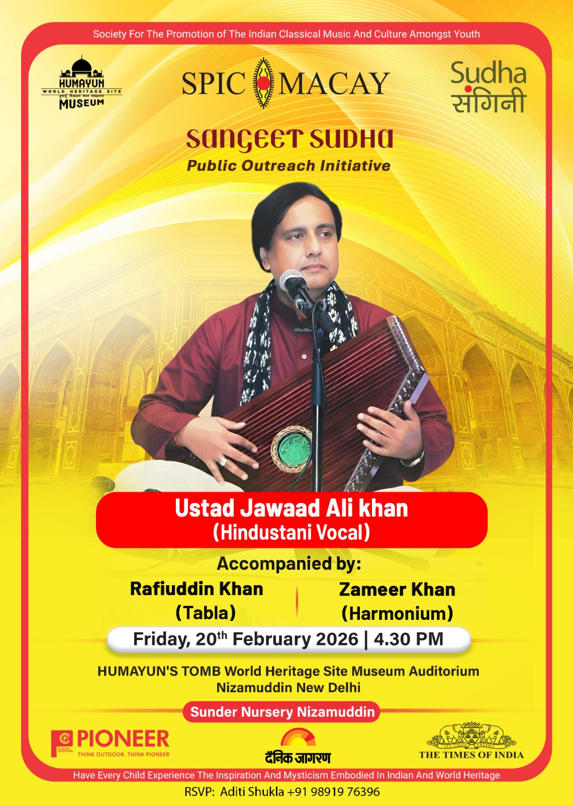 Join us for Sangeet Sudha! Immerse yourself in an evening of soul-stirring classical music featuring :- Ustad Jawaad Ali Khan (Hindustani Vocal) accompanied by Raifuddin Khan on Tabla and Zameer Khan on Harmonium