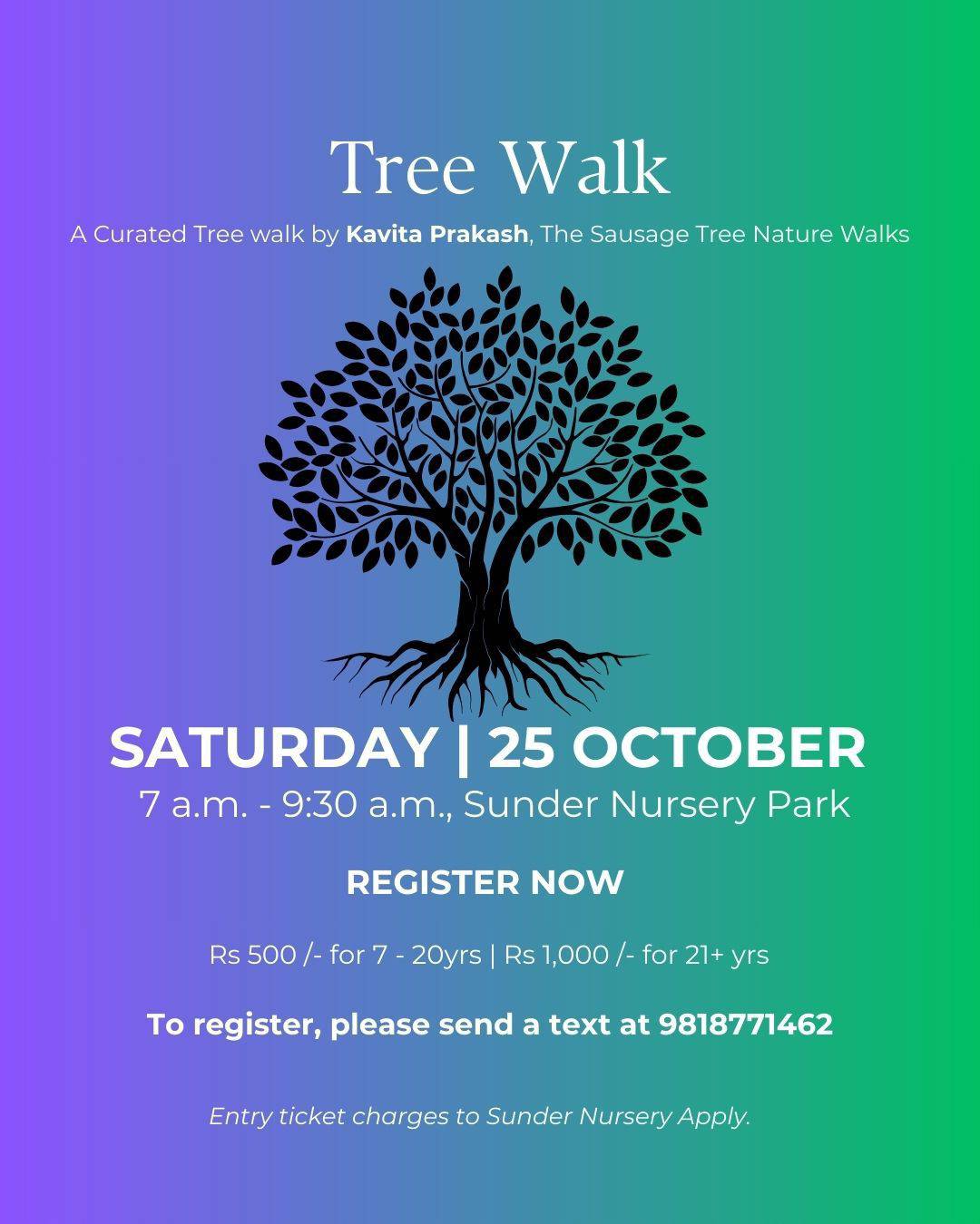 The Sausage Tree Nature Walks are named after the only exotic tree species planted as an avenue tree, in Lutyens’ Delhi. The walks were launched on 5th June 2013, World Environment Day. The intent of the walks is to introduce the participant to select trees by their common names whilst sharing some interesting facts about them thereby creating awareness and a meaningful association.